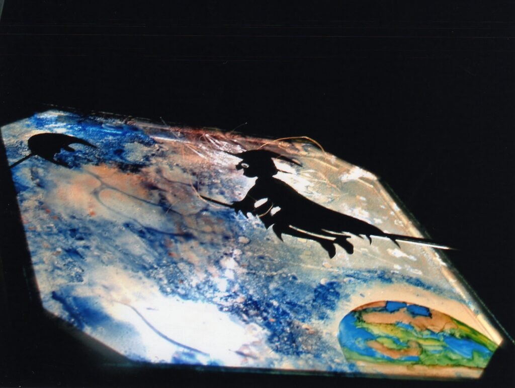 The images projected through light create a sensitive, elegant atmosphere, of great visual richness, and of intense seduction that transports us to the symbolic world.