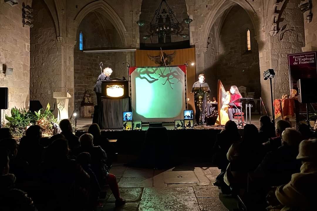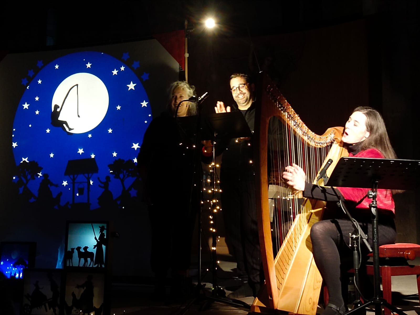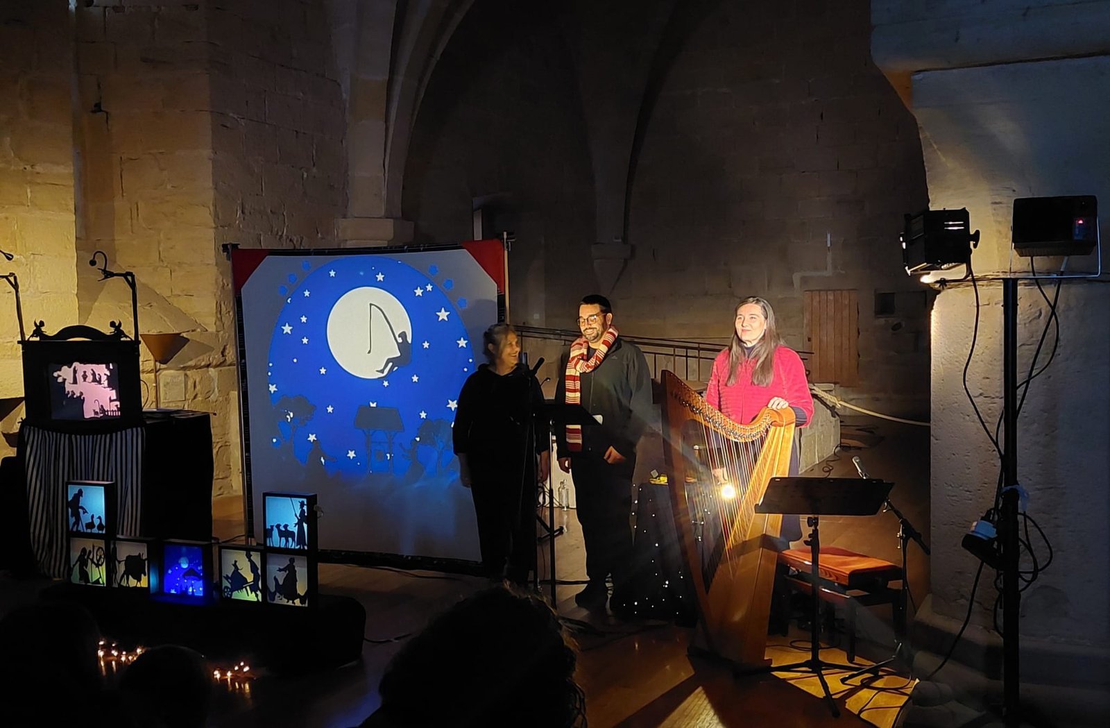 Un espectacle que combina ombres i música en directe. Recrea les figures del pessebre a partir de fragments del poema de Joan Alavedra i nadales tradicionals. La titellaire ombrista dóna vida a les escenes amb el teatre d’ombres, acompanyada de dos cantants, una arpa i percussions, creant un ambient emotiu i màgic per compartir amb família i amics.